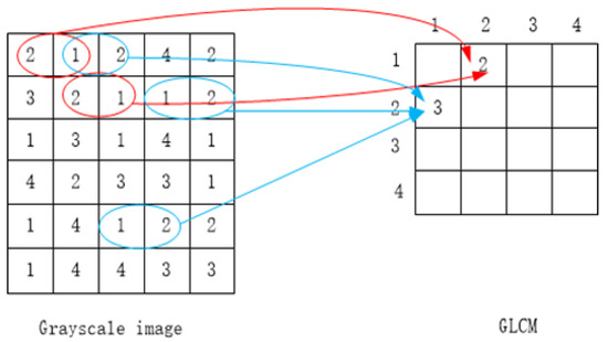 GLCM is a description of image texture. It counts the relationship between two pixels of equal distance in the same direction in the gray image. The acquisition method of GLCM is shown in Figure 6.