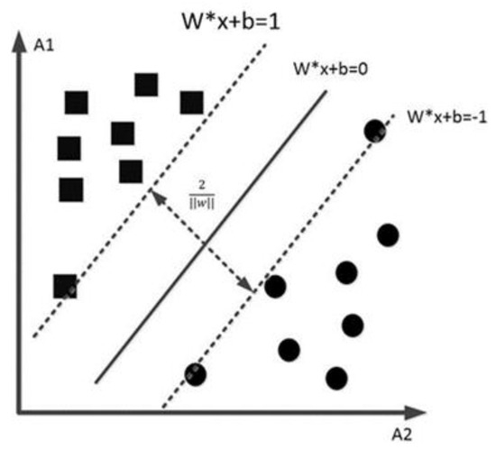 The classification principle of the SVM is shown in Figure 9 [38], circles and squares represent different categories, the solid line is the decision boundary between the two categories, and the dotted line represents the interval between the two categories. and the hyperplane is calculated as: