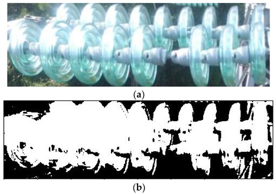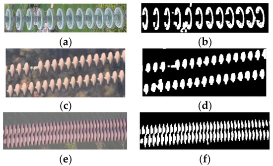 Figure 10a,c,e show the most common types of insulators made from glass and porcelain; the missing cap phenomenon often occurs in these three types of insulators. The binary images obtained after the k-means clustering segmentation of Figure 10a,c,e are shown in Figure 10b,d,f, respectively. Although there is still some noise and over segmentation in the segmented binary image, these factors do not affect the “missing insulator-cap” judgment.