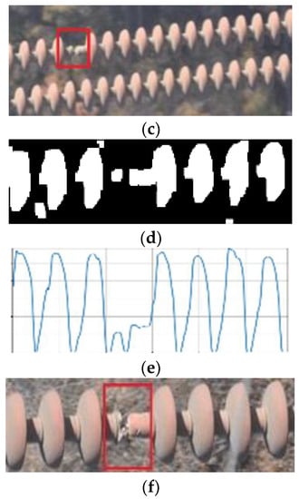 In the pixel statistical diagram of an insulator, the approximate position of the abscissa of the missing cap can be quickly located. The position in the RGB image of the insulator missing cap is shown in the red box in Figure 11f. In Figure 11b, the distance between adjacent peaks is almost equal, and the wave crest of the missing cap position is obviously much smaller than those of the other peaks. Since the insulators in the figure are arranged in double strings, it is necessary to return to the binary image to locate the “missing insulator-cap”. The abscissa range of the missing cap is obtained according to the pixel statistical graph, and then the ordinate of the missing cap is further determined according to the arrangement of insulator caps and two strings of insulators in the abscissa range. Due to the influence of complex background factors, there may be some noise in the segmented binary image, as shown in Figure 11d. However, the location of the missing cap can still be clearly found in its pixel content statistical graph, as shown in Figure 11e.