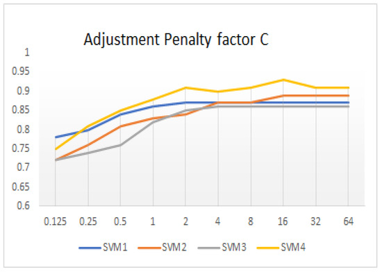 is the classification loss of the i-th sample and is the composite error. The value of C represents the attention given to the sample value during training. When C is infinite, samples with classification errors are not allowed, so this problem becomes a hard-boundary SVM problem. When C infinitely approaches 0, the formula no longer focuses on whether the classification of the sample is correct, and the SVM loses the meaning of the classification. The debugging process of the penalty factor C is shown in Figure 12.