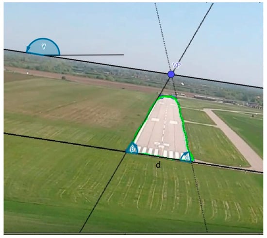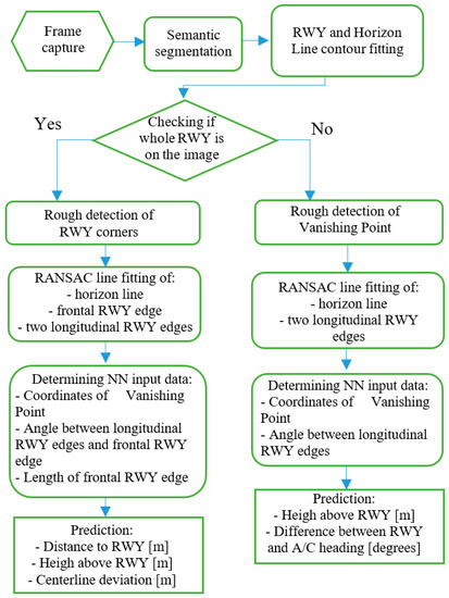 The first step of the system is the registration of an image. This image is the input of semantic segmentation to recognize three different classes, being the runway, terrain, and the area above the horizon line. In the next step, the contours are adjusted to the highlighted areas. At this stage, the region of the intended runway is selected and a preliminary check is made to ensure that the aircraft is not directly above the runway. Here, the algorithm branches out, which is directly related to the differences between the approach to the runway and the final landing phase when the aircraft is already over the runway. The next step is to preliminarily analyze the runway area and measure the runway edge points and the vanishing point (VP), which is where the lateral runway edges converge. At the same time, the horizon line is defined. All the lines to be detected were matched using the RANSAC algorithm (Figure 2).