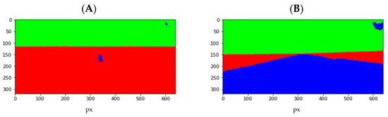 The choice of U-Net for segmentation resulted from the analysis of several different models. One of the evaluation criteria was the ability of the neural network to segment the runway both at a long distance (Figure 3A) and in its immediate vicinity (Figure 3B) to use a single model for the entire flight. The U-Net network provided very stable results in the test data, with satisfactory processing speeds.