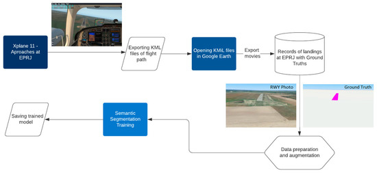 The next step is to prepare the target data in video form. The data were generated using the Google Earth platform, which provides a detailed view of the entire world. This platform is continually being developed and the data are constantly updated, which also has an impact on the ANN training process [23]. Approximately 100,000 synthetic pictures of the runway with annotations were prepared. The pictures were divided into training and validation data (approximately 10%). Strong augmentation was used because of the use of synthetic data, significantly deviating from the target data. The annotations were created by applying a simple and uniform segmentation color (magenta) to the runway surface. Then, the recordings were exported with the original image of the runway and its marked (annotated) image.