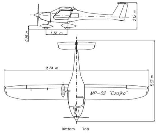 Outline of the MP-02 Czajka plane with dimensions.