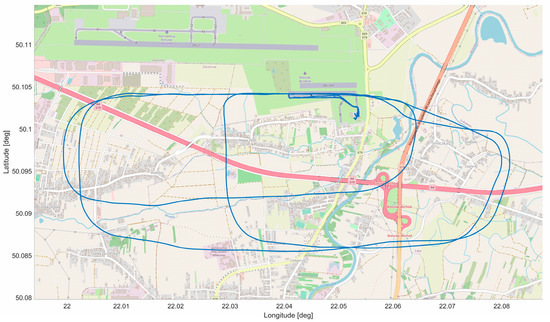 In-flight tests were carried out on the Czajka MP-02A aircraft (Figure 5), which is registered in the SPECIAL class, as a research aircraft in the Department of Avionics and Control Systems at the Rzeszów University of Technology. The verification flight plan included three flights at EPRJ Airport and is shown in Figure 6. The flights performed were intended to differ from each other so that the different approach paths would display slightly different parameters. The video recording device used for the tests was a GoPro 7 sports camera. This was placed directly under the right wing of the aircraft (Figure 7). This camera attachment provides a very good picture of the runway during the approach to landing, but it does affect the indication of the aircraft’s position relative to the runway axis. Videos were recorded at 25 frames per second with full HD resolution. The reference data for the vision system were taken from the onboard recorder (Dynon Avionics D700 + SV-ADAHRS + SV-GPS) and are the barometric altitude, position determined by the GNSS system, and magnetic heading from the AHRS system.