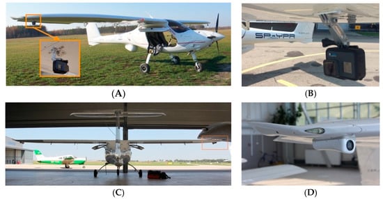 MP-02 Czajka plane with a GoPro 7 camera installed for preliminary experiments (A,B) and its installation for the planning of more advanced experiments in the future (C,D).