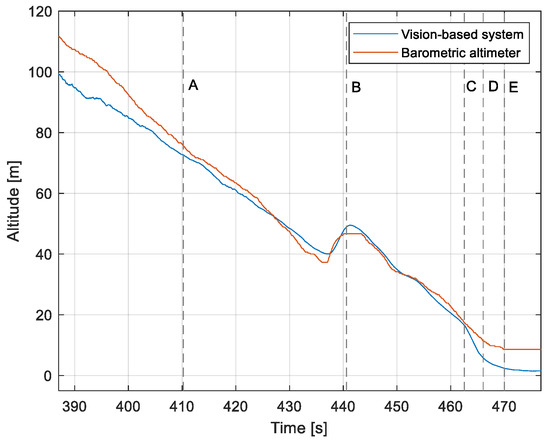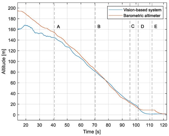 Altitude relative to the airside: Flight no. 2 (markers A–E correspond to the moment of recording the images in Figure 11).
