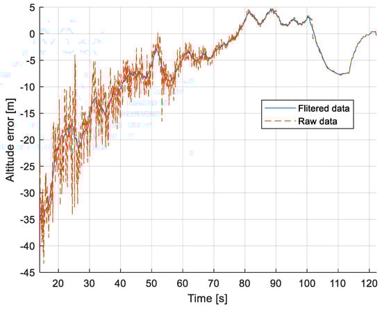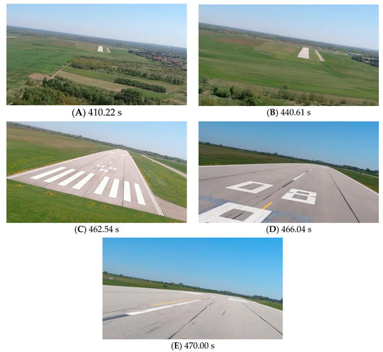 Figure 9, Figure 11 and Figure 13 show selected frames from the recorded and analyzed video recordings. Figure 9A–C, Figure 11A,B and Figure 13A show situations in which the runway is visible from a relatively long distance and occupies only a fragment of the frame. By referring to the appropriate markers (indicated by a dotted line) in Figure 8, Figure 10 and Figure 12, it is easy to determine the time of measuring the altitude to which they correspond. In the case of flight no. 1, an analysis of the relative error of the altitude measurement (calculated relative to the barometric altitude measurement) was also included, which presents the raw measurement data obtained at the ANN output and the filtered (resulting) data.