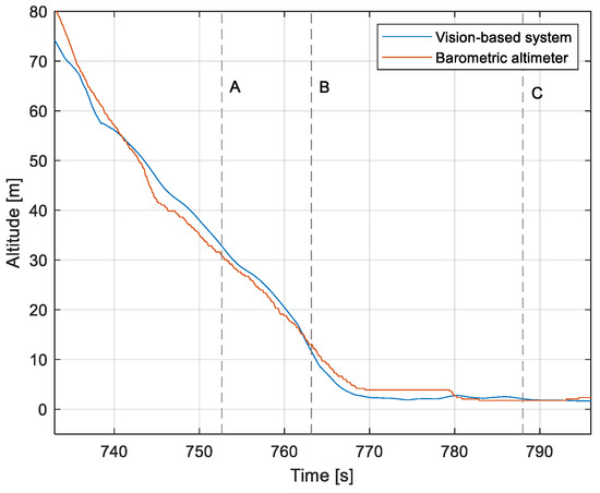 Altitude relative to the airside: Flight no. 3 (markers A–C correspond to the moment of recording the images in Figure 13).