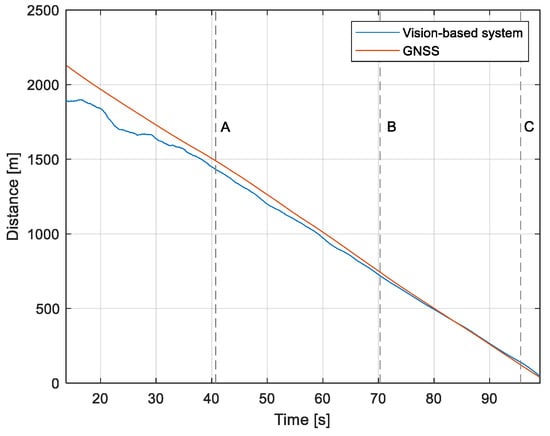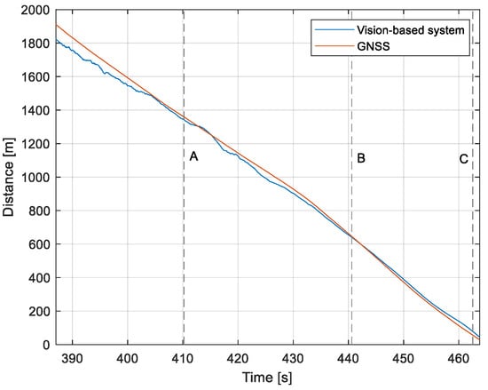 Distance from the runway: Flight no. 2 (markers A–C correspond to the moment of recording the images in Figure 11.