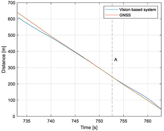 Distance from the runway: Flight no. 3 (marker A corresponds to the moment of recording the images in Figure 13.