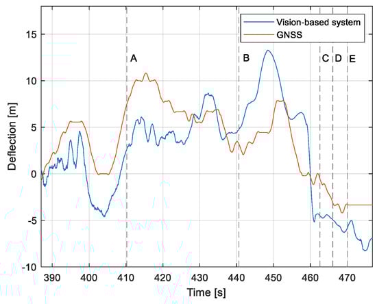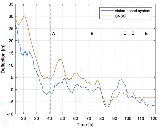 Linear lateral deflection from the center line: Flight no. 2 (markers A–E correspond to the moment of recording the images in Figure 11.