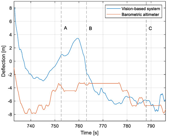 Linear lateral deflection from the center line: Flight no. 3 (markers A–C correspond to the moment of recording the images in Figure 13.