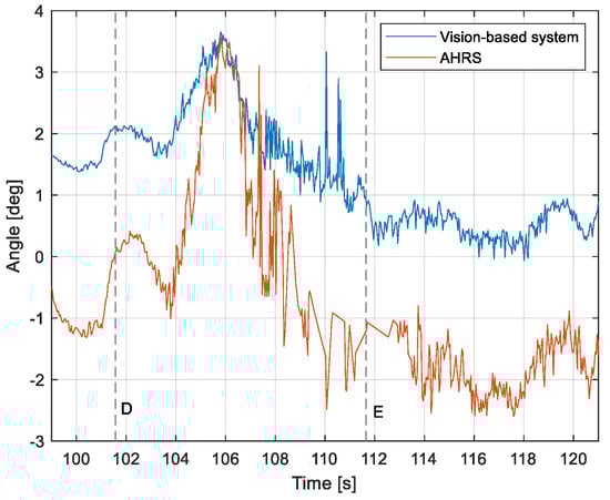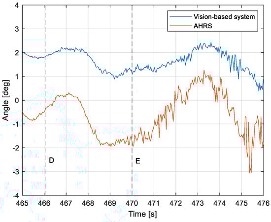 Angle between the longitudinal axis of the aircraft and the centerline: Flight no. 2 (markers D,E correspond to the moment of recording the images in Figure 11.