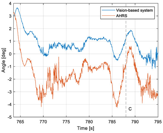 Angle between the longitudinal axis of the aircraft and the centerline: Flight no. 3 (marker C corresponds to the moment of recording the images in Figure 13).