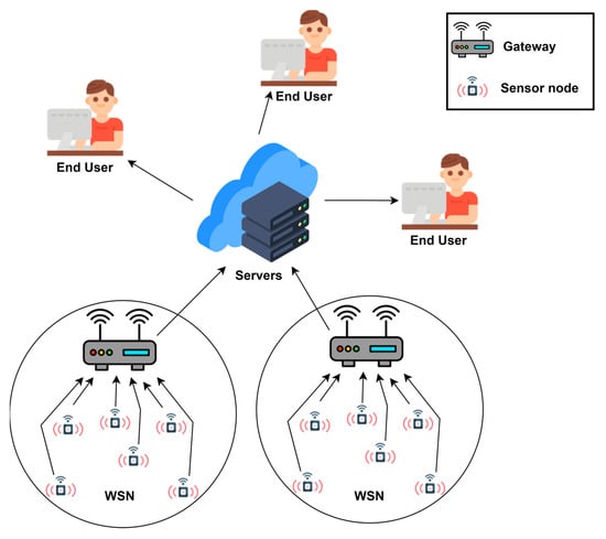 A WSN refers to a group of spatially dispersed wireless sensors distributed over a large geographical area that collect data from the environment and then send them to a sink node for processing and storage purposes. Using different visualization algorithms, the collected information is presented to users. The architecture of such a wireless sensor network can be seen in Figure 1. The structure includes a centralized sink node (Gateway) that is usually connected to the internet, and wireless sensors nodes, which is a communication mechanism that allows the information to be transmitted to the end users.
