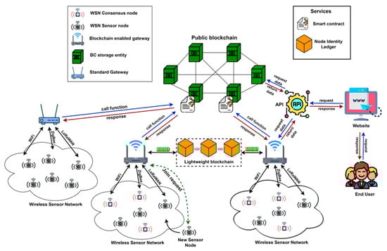 Blockchain technology will allow IoT networks to move away from the classic structure of a WSN network, where nodes communicate with a centralized server, used for data storage, authentication, and sensor authorization, to a more secure and flexible approach. Blockchain offers a new method of decentralized and distributed management of both data and nodes in a P2P network. In our system, WSN nodes have full control over the network, which means that any new WSN that wants to use the network must be accepted by the other WSN enrolled in the consensus mechanism. The architecture of the wireless sensor network based on the blockchain technology proposed can be seen in Figure 2. The proposed architecture integrates a novel modular technique that involves using a lightweight blockchain and public blockchain for WSN data storage.
