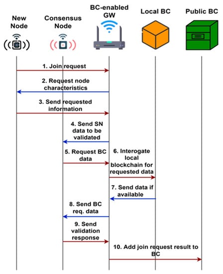 As previously specified, both consensus nodes and BCeGWs will implement the network consensus mechanism. Consensus nodes implement the PoS mechanism when a new node wants to join the network, and the BCeGW when a new block is added to the public blockchain. The authentication scheme and the steps performed by each entity can be seen in Figure 3.
