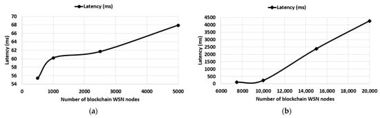 Average latency metric for the proposed blockchain architecture: (a) 500, 1000, 2500, 5000 blockchain WSN nodes; (b) 7500, 10,000, 15,000, 20,000 blockchain WSN nodes.