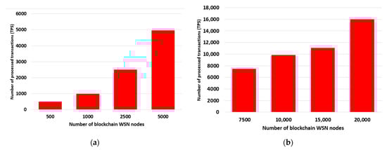 Figure 5a,b show the transaction throughput, which is the number of transactions that a blockchain architecture can process. In our case, transactions are the data packets sent by the blockchain WSN nodes. In our testing, we have approximately 496.31 TPS for a total of 500 blockchain WSN nodes, and 16,006.73 transactions for a total of 20,000 blockchain WSN nodes.