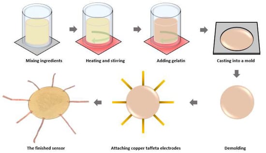 The equivalent electrical conductivity of the human skin, including its underlying layers, is approximately 0.090 S/m [18]. This value may vary among individuals and depends on multiple factors, such as skin region, water content, skin diseases, and temperature [19,20,21]. In order to detect subtle finger contact, we prepared a sensor using a hydrogel material with significantly less conductivity than this approximated conductivity value. The hydrogel was made of gelatine (Clear and Unflavoured Natural Gelatin, Davis Food Ingredients, Auckland, New Zealand), glycerol (HealthE glycerol BP liquid, Jaychem Industries Ltd., Auckland, New Zealand), and deionized water (RS PRO deionized water for PCB, RS Components Ltd., Corby, UK). Gelatine is a biopolymer extracted from animal collagen [22]; it can absorb water to form a hydrogel. Glycerol was used as a preservative to keep the hydrogel long-lasting without needing insulation from the air. The fabrication procedure is illustrated in Figure 3. The liquid ingredients, which consisted of 40 g of deionized water and 40 g of glycerol, were mixed in a beaker. The mixture was stirred using a glass rod and heated to 80 °C using a hot plate. Then, 20 g of gelatine powder was added to the mixture. The mixture was continuously stirred at 80 °C until the gelatine powders were completely dissolved. The obtained aqueous solution was cast into a disc-shaped mold with a diameter of 10 cm and cooled at room temperature (15 °C) for 3 h to allow gel formation. After the gelation process was finished, the hydrogel was released from the mold. The obtained hydrogel has a thickness of 2 mm and a diameter of 10 mm. Copper taffeta strips were directly attached to the hydrogel by pressing the strips against the hydrogel using a soldering iron briefly. The heat allowed slight melting of the hydrogel so that the adhesion was realized by the self-healing property [23] of the physically crosslinked hydrogel.