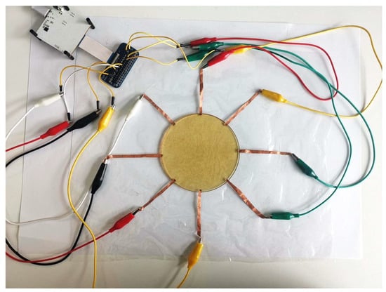 In order to implement tomographic imaging on the acquired hydrogel sensor, we used Spectra (Mindseye Biomedical, San Francisco, CA, USA) as the data acquisition system to perform current excitation and voltage measurements. The system is based on an ADUCM350 microcontroller for impedance analysis with a 16-bit resolution and a 160 kSPS sampling rate. The hydrogel sensor was connected to Spectra, as shown in Figure 4.