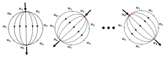 We adopted the opposite current excitation strategy [24] to drive the sequence of voltage measurement. The opposite strategy is illustrated in Figure 5. The opposite pattern allows the current to flow across the domain and passes the central region more uniformly than the other commonly used adjacent strategy; therefore, touches applied to the interior region of the sensor can be detected more efficiently. Following this strategy, an alternating excitation current of 25 kHz was passed through two electrodes located at opposite ends of the domain; meanwhile, voltages at the remaining electrodes were measured. Once this step was completed, the excitation channel was switched to the next pair of electrodes by controlling the embedded multiplexers. This process was repeated for all opposite pairs of electrodes so that the voltage data at each electrode during each current injection was recorded.