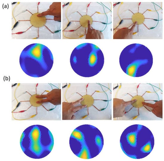 The proposed sensor is used for detecting finger contacts. (a) Conductivity images showing contact made by a single finger. (b) Conductivity images showing contact made by two fingers simultaneously.