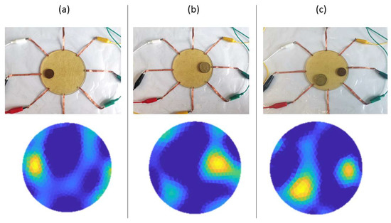 The sensor’s ability to distinguish the difference in contact area was examined. Coins of different dimensions, including a ten-cent coin with a diameter of 20.5 mm and a two-dollar coin with a diameter of 26.5 mm, were placed on top of the sensor to produce electrical contact with different areas. The two coins have weights of 3.3 g and 10 g, respectively. Conductivity images were reconstructed using EIT and are demonstrated in Figure 7. In Figure 7a,b, conductivity images corresponding to the contacts made by the two coins separately. It can be seen that, although the silhouettes of the obtained conductivity contrasts were not precisely matched with the actual contact area, the difference between the sizes of the two silhouettes was roughly exhibited, indicating the sensor could identify the relatively larger or smaller contacts when multiple contacts are made. This ability was more clearly demonstrated in Figure 7c, where the two coins were placed onto the sensor at the same time. The obtained conductivity image demonstrates a clear difference between the sizes of the two conductivity contrasts, confirming that the proposed sensor could roughly distinguish different sizes of contact area.
