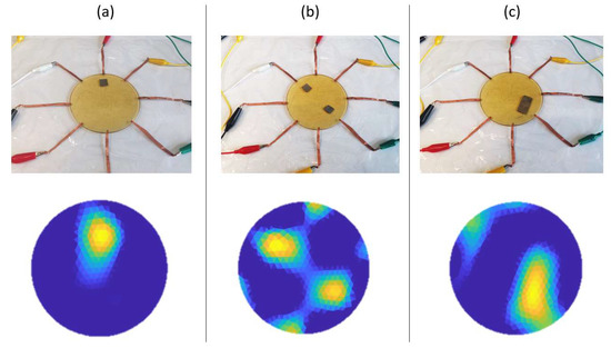 The sensor was tested for its ability to detect subtle contacts. Silver fiber fabric strips that possess negligible weight were placed on top of the sensor to mimic a forceless finger touch. Square-shaped strips of two dimensions were used: the smaller strip has an area of approximately 1 and weighed about 11 mg; the larger strip has an area of approximately 3 and weighed about 35 mg. The strip placement and the corresponding conductivity images produced by EIT are demonstrated in Figure 8. In Figure 8a, the smaller strip was placed on top of the sensor to mimic a single forceless touch, which could be detected from the obtained conductivity image. In Figure 8b, two strips of the same 1 area were placed onto the sensor to mimic double forceless contacts applied simultaneously. The obtained conductivity image successfully exhibited the presence of both contacts. In Figure 8c, the larger strip was placed in contact with the sensor. The corresponding conductivity image exhibited an evidently larger contact area than the results in Figure 8b,c. These results confirmed that the proposed sensor could effectively detect contacts without requiring a noticeable force. It was worth noting that forming an electrical path between the sensor and the contacting objects does not necessarily require applying a force; therefore, the proposed method could theoretically achieve touch detection even if there is no force exerted on the sensor.