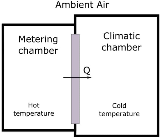 The main parts of a hot-box instrument are defined in the different methodology standards presenting some similarities summarized in Figure 1. A hot-box is formed by two main zones: the metering chamber, or hot zone, where the sample is influenced by a constant thermal flow and represents the indoor ambient in a building application. And the climatic chamber, see Figure 1, where the sample transmits the thermal energy changing the chamber ambient. The energy transmission can be accelerated or maintained over time creating a colder ambient which maintains the climatic chamber at lower temperature than the metering chamber. For the correct estimation of the amount of energy that is effectively transmitted through the sample, in relation to the thermal losses, it is necessary to measure the different energy wastes depending on the hot-box methodology used. That is, the losses through the box itself or additionally, transmission losses of the material to external environments should be considered to obtain the most accurate thermal resistance estimation. In order to create a hot-box system and measure the thermal performance of building materials and construction systems, a hot-box must meet calibration and requirement standards. This calibration is described in three main sections: the system itself (hot-box assembly calibration); its components (sensor calibration); and the procedures to be followed to achieve the required reliability.