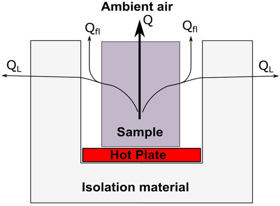 The new aHB should minimize the impact of thermal losses, so it is necessary to characterize all error sources present during the test. Figure 2 shows the possible thermal paths that the heat flux can take during the test. The direct heat flux generated by the hot plate is injected into the sample during the test. While Q is the heat flux measured on the opposite face in contact with ambient environment, QFL are the paths of flanking heat-flux losses and QL are the paths of lateral heat-flux losses.