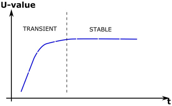 Ideally, without heat-flux losses, the value Q will be equal to the heat flux induced by the hot plate. But in a real setup, the value of QFL is equal to the flowing heat flux though the insulating material used to adapt the instrument to different sample sizes and shapes, and the QL value is equal to the flowing heat flux though the lateral and lower instrument walls. In this sense, minimizing the values of QFL and QL, the Q value will remain stable over time and equal to the heat flux generated by the hot plate. When this condition happens, the sample is thermally stable, and the thermal transmittance can be obtained using Equation (1). Figure 3 shows a schematic representation of U-value evolution when heat losses are minimal, and the sample is exposed to a temperature gradient incrementally. From initial state, the sample under test moves to stable state passing through a transient state, while the hot plate is working, injecting thermal energy to the sample. During transient period, the heat flux, and the temperature gradient change over time. The continuous monitoring of temperature and heat flux variables helps to determine the instant where the sample enters into the stable state. This condition is established when the U-value slope is lower than 5%. In that case, the stable U-value can be defined as the final thermal transmittance value of the material.