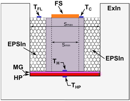 When the sample material or element is in place on the TH sensor, the space between the sample and the ExIn walls is filled with backfill material. This backfill material (EPSIn–EPS insulator in Figure 4) will remain in contact with the sample under test and provide the best padding to minimize lateral and flanking heat losses. In the proposed aHB, the sample under test is surrounded with expanded polystyrene in the form of 3 mm beads with a density of 40 kg/m3. In this way, the width of the insulation (ExIn + EPSIn) between the sample and the external ambient is increased while better adaptation to the specific shape and surface irregularities of the sample is achieved.