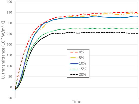 The final U-value is estimated applying Equation (1) during the stable period. The rest of sensor data stored during the test could be important for estimating the thermal behavior of the constructive element, because these data could be related to the thermal capacity of the materials forming the constructive element and may be considered as inertial mass in thermal comfort studies in building projects.