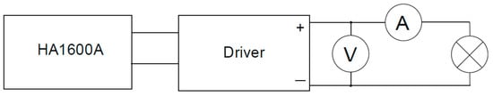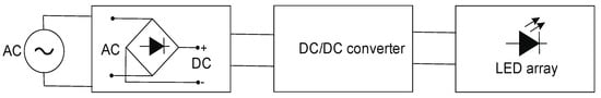 A typical LED lamp design is shown in [18]. LEDs require the so-called drivers, i.e., control and power circuits, so dedicated integrated circuits are manufactured to power LED lamps. The block diagram of the LED lamp with an integrated driver is shown in Figure 1.