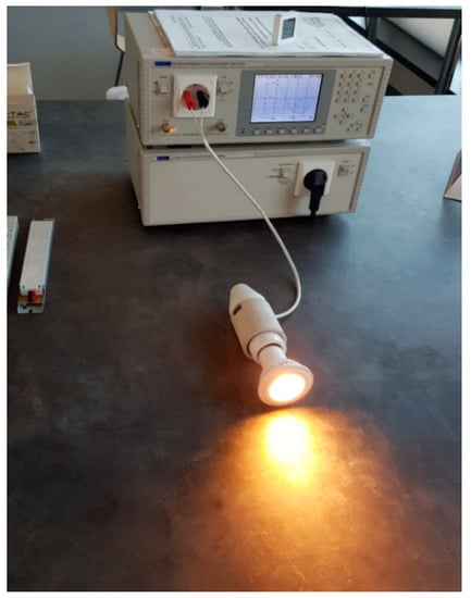 The test stand allows testing of power quality parameters when powering selected light sources. The stand (Figure 2 and Figure 3) and tests were performed in accordance with the PN-EN IEC 61000-3-2: 2019-04. The tests were carried out under standardized atmospheric conditions, i.e., the air temperature was in the range of 20–27 °C. Measurements were performed on new sources. The lamps were lit until stabilization, which was taken as no change in the consumed power by more than 1% in 5 min.