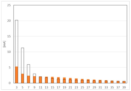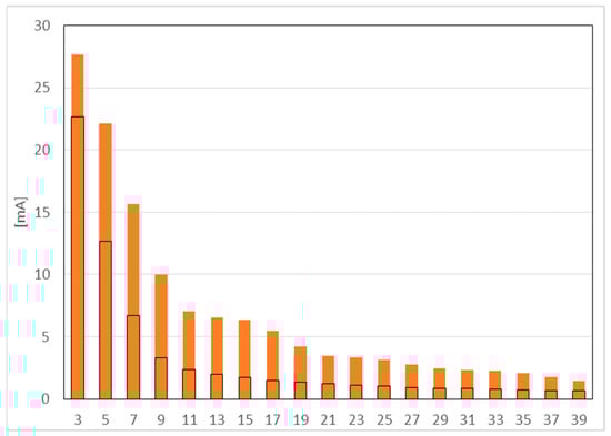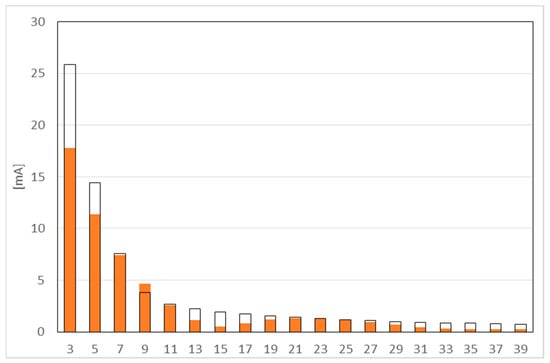 Figure 4 shows the results of measurement for harmonics from 3 to 39. The black line indicates the permissible value, orange color - measured values.
