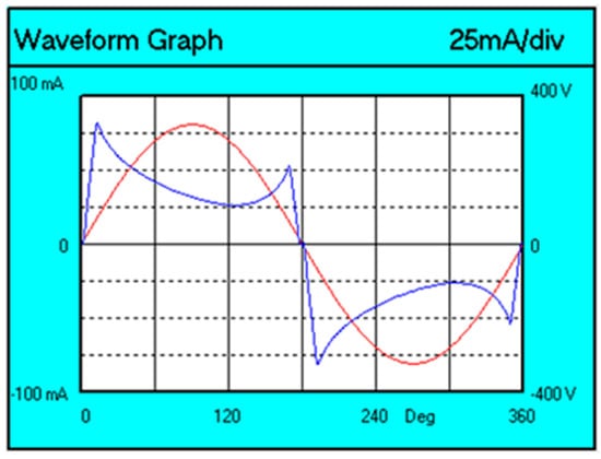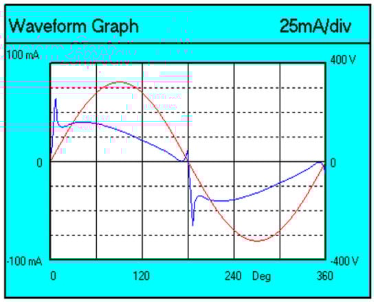 The voltage (red color) and current (blue color) waveforms of the tested lamp are shown in Figure 5.