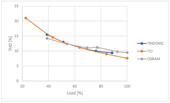 In each of the tested power supplies, a clear decrease in the generated higher harmonics was observed with increasing load. THD remained similar for each power supply with the same percentage of load.