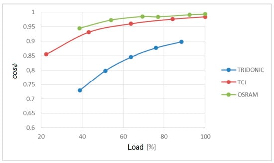 OSRAM and TCI power supplies maintain similar power factor values, which increases as the load increases. The Tridonic power supply deviates significantly from the other two products tested.