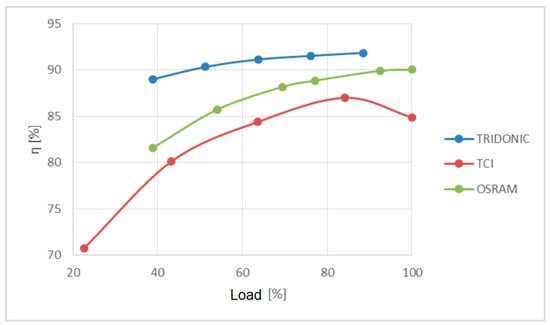 The best efficiency of the three power supplies tested is that of Tridonic, despite having the worst power quality parameters. The TCI power supply from the measurement at about 85% of the maximum load decreased its efficiency, which is consistent with the data sheet available on the manufacturer’s website.