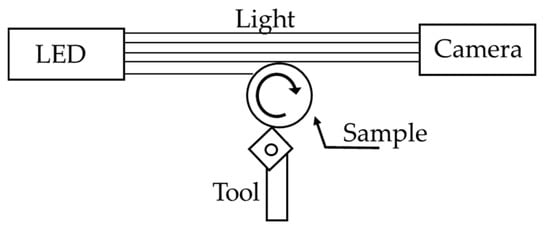 A scheme of how it works is presented in Figure 1: a turned sample (a cylinder) is placed in front of a camera, its axis is orthogonal to the camera axis, the camera axis is aligned tangent to the cylinder, and it is backlit by a collimated source of light. This optical configuration is typical of telecentric vision [31] or backlit vision [32] and it provides the image of the edge of the sample.