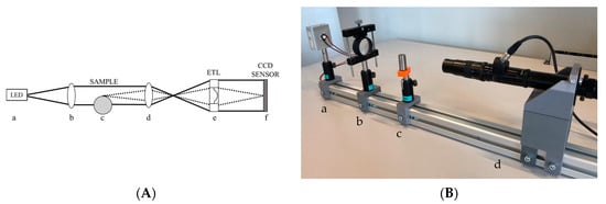 Measurement system setup. (A) is a schematic of the instrument composed as follows: (a) LED light, (b) lens, (c) test sample, (d) dynamic focus lens, (e) electrically tunable lens (ETL), (f) “2/3” CCD camera sensor. The black lines represent the light rays from the LED to the sensor, while the dashed lines are from an image point on the focus plane to the sensor. (B) is an image of the actual measurement setup: (a) LED light, (b) lens, (c) test sample, (d) objective.