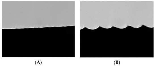 The target images are a sharp close-up view of the edge of the sample, where the wavy shadows created by the machining process are clearly visible, see Figure 3. In the figure are depicted two different samples with different surface roughness. The image on the left is of a sample with low surface roughness (Ra = 2.4 µm), while the one on the right has much higher surface roughness (Ra = 15.1 µm). At the edge of the image, a light scattering effect is visible. This will be discussed in Section 2.3.3.