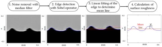 Steps of the measurement algorithm: (1) Filtering of the image; (2) The blue profile line is determined through the Sobel edge detection method; (3) The red line is the mean line obtained with the linear fit of the edge; (4) Ra is measured as the average of the distances Zi between each ith point of the profile and the mean line.