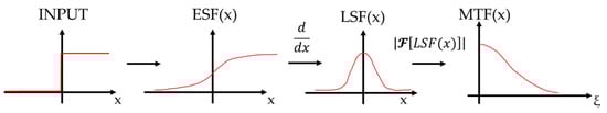 The response of the system to the step input is the edge spread function (ESF), then the spatial derivative of ESF data produces a line spread function (LSF), which is then Fourier transformed into the modulation transfer function (MTF).