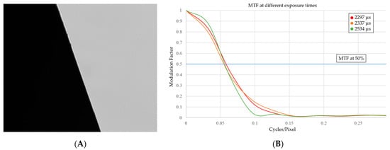 (A) Image of the sharp edge used as input; (B) MTF of the imaging system at different exposure times (the blue line is the MTF at 50%).