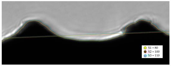 The position between the mean lines changes only by 1 pixel. This difference is also coherent with the offset of the profile lines which also differ by 1–2 pixels. If a change in threshold causes a shift in the profile, the estimate of Ra does not vary, since Ra is a quantity that describes the shape of the profile, not its actual position. The Ra values corresponding to the three thresholds (S1, S2, S3) are, respectively: Ra = 16.1 µm, Ra = 16.6 µm and Ra = 16.9 µm.